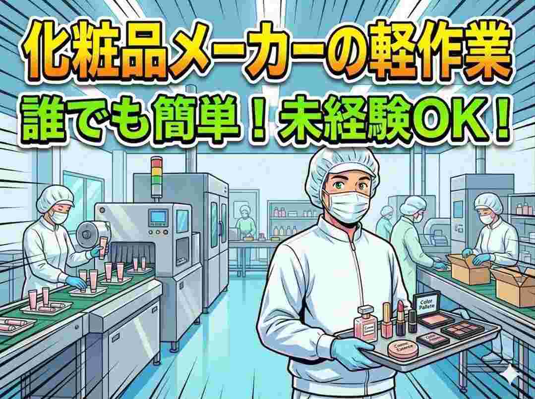 化粧品メーカーの工場内で、製造サポートや出荷準備を行う軽作業のお仕事です。主に充填、検品、ラベル貼り、包装、箱詰めなどの工程を担当します。作業はマニュアルや手順に沿って進めるため、未経験からでも始めやすい内容です。